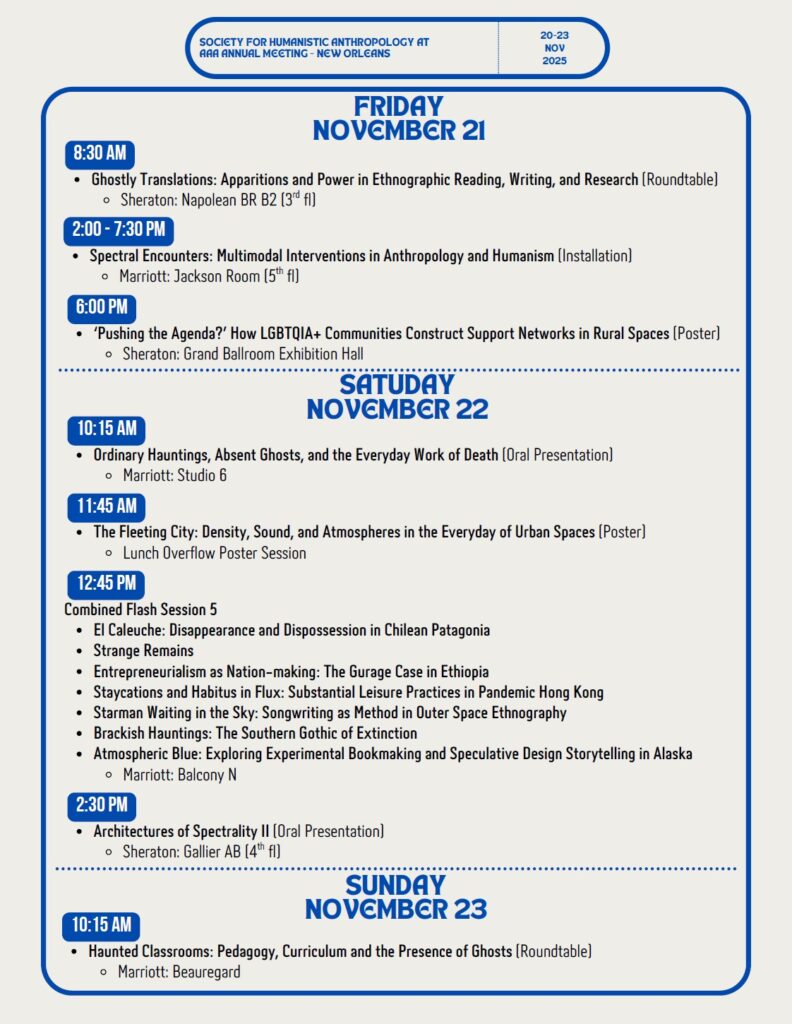 Take a look at the calendar of events from the Society for Humanistic Anthropology at AAA Annual Meeting 2025 – New Orleans, LA (20-23 Nov)