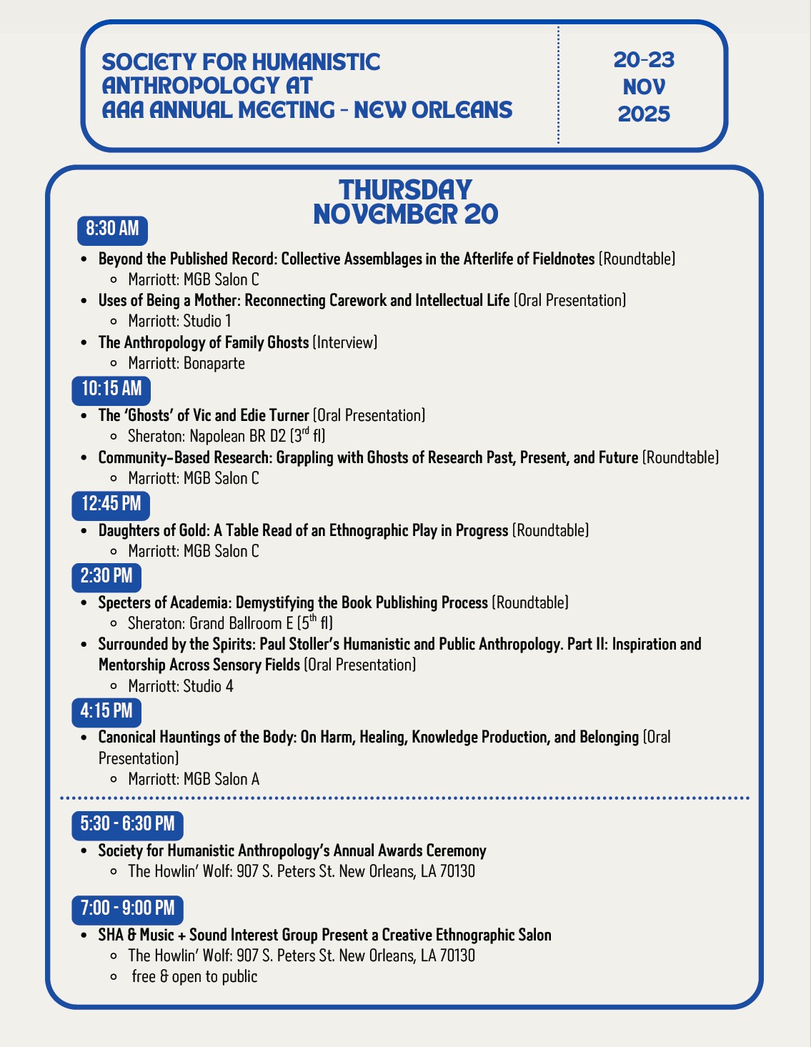 Take a look at the calendar of events from the Society for Humanistic Anthropology at AAA Annual Meeting 2025 – New Orleans, LA (20-23 Nov)